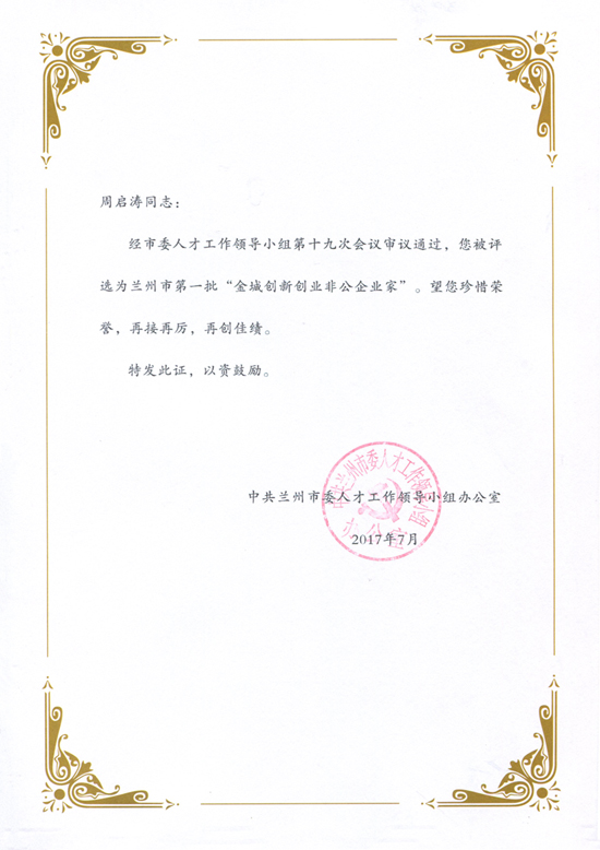 2017年11月22日,甘肅中集實業(yè)集團有限公司董事長周啟濤榮膺蘭州市首屆“金城創(chuàng)新創(chuàng)業(yè)非公企業(yè)家”;